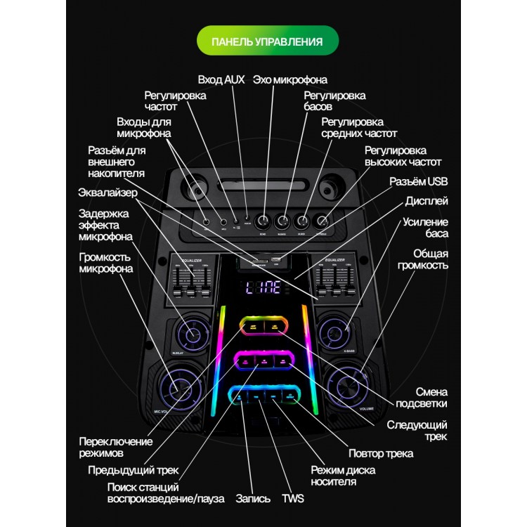 | Функции звука | Регулировка ВЧ, регулировка НЧ, синхронизация колонок, эквалайзер |