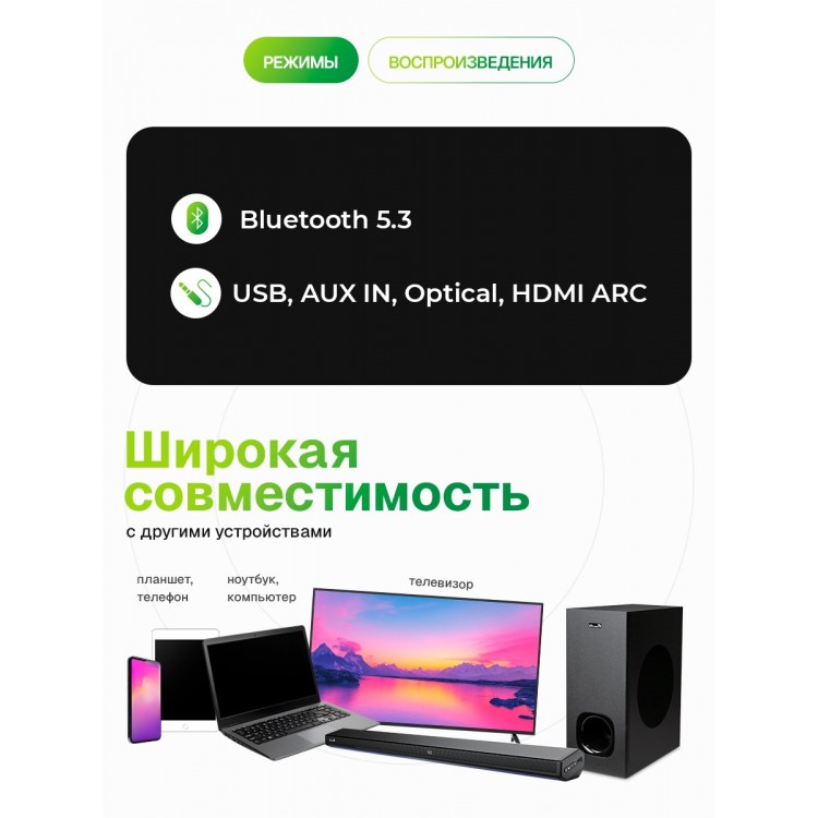 Саундбар поддерживает беспроводное подключение через Bluetooth, а также имеет различные разъёмы и интерфейсы, включая USB Type B, вход HDMI, цифровой коаксиальный и оптический входы. Вы сможете воспроизводить аудио с карты памяти и наслаждаться любимыми композициями.