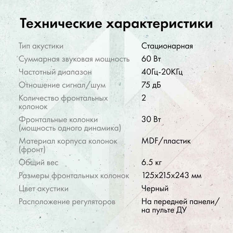 Корпус акустики выполнен из MDF, дерева и пластика, что придаёт ей стильный и современный вид. Акустика имеет две полосы и оснащена разъёмом AUX для подключения различных устройств.