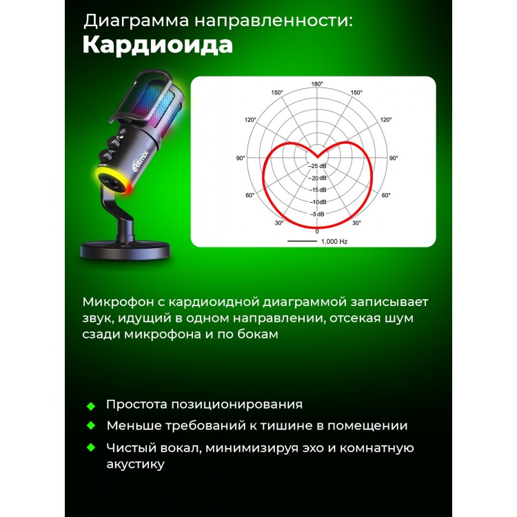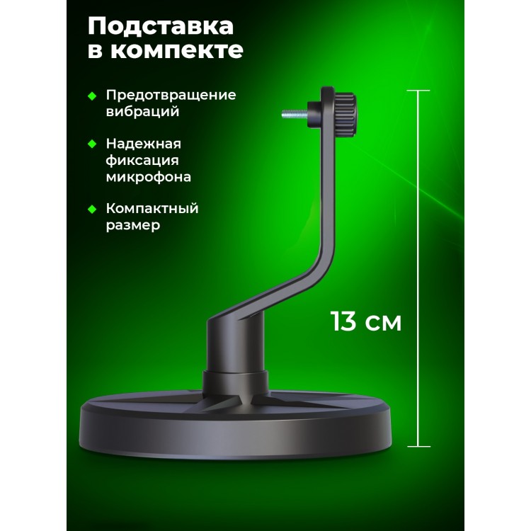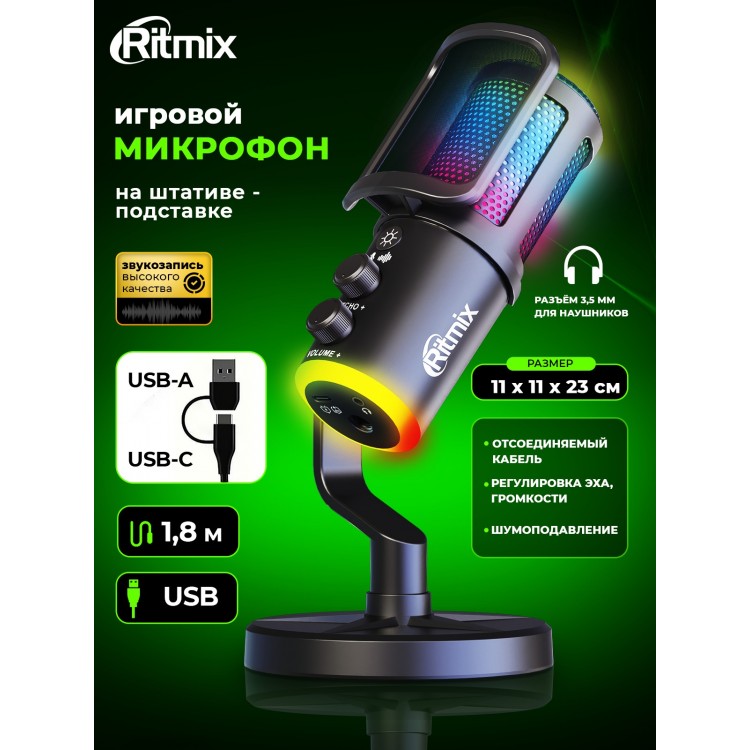 Название Микрофон RITMIX RDM-178 USB Gaming Black, RGB-подсветка, шумоподавление, конденсаторный; Бренд Ritmix; Цвет товара Black; Футляр в комплекте Без футляра; Тип Микрофон проводной, микрофонный комплект; Комплектация радиосистемы Микрофон; Тип микрофона Конденсаторный; Назначение Для интервью, для конференций, для подкастов/радио/телевидения, для стриминга; Конструкция микрофона Настольный; Диаграмма направленности микрофона Кардиоидная; Чувствительность -39 дБ; Мин. частота 20 Гц; Макс. частота 20000 Гц; Макс. звуковое давление 108 дБ; Импеданс 16 Ом; Отношение сигнал/шум 75 дБ; Питание От кабеля, по USB; Разъем микрофона USB; Особенности RGB-подсветка, выход на наушники, кнопка отключения микрофона, шумоподавление; Материал корпуса Металл + пластик; Длина кабеля 1.8 м; Ширина 50 мм; Высота 150 мм; Глубина 50 мм; Подробная комплектация Микрофон - 1 шт, Поп-фильтр - 1 шт, Подставка с креплением - 1 шт, Кабель - 1 шт, Руководство пользователя, Гарантийный талон; Гарантийный срок 1 г; Цвет черный;