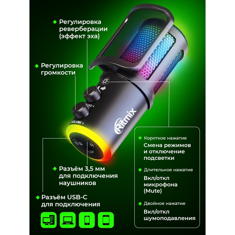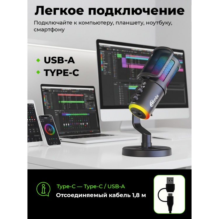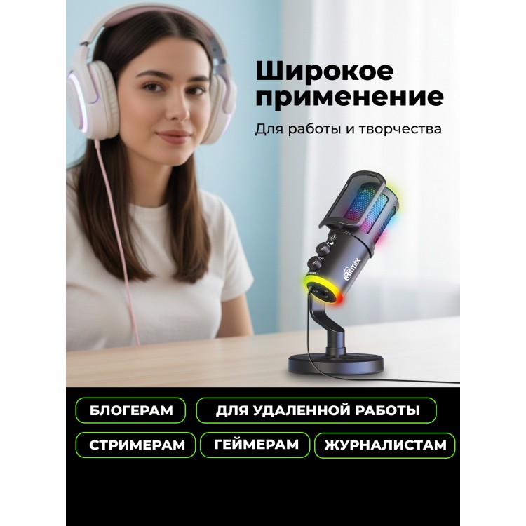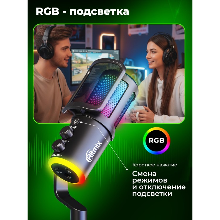 НазваниеМикрофон RITMIX RDM-178 USB Gaming Black, RGB-подсветка, шумоподавление, конденсаторный
