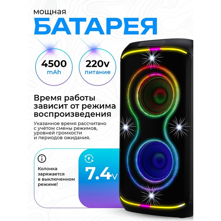 Благодаря автономному питанию и времени работы до 4 часов, вы сможете наслаждаться музыкой где угодно. Управление системой возможно с помощью кнопок, пульта дистанционного управления или смартфона.