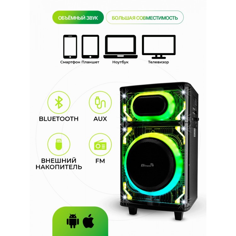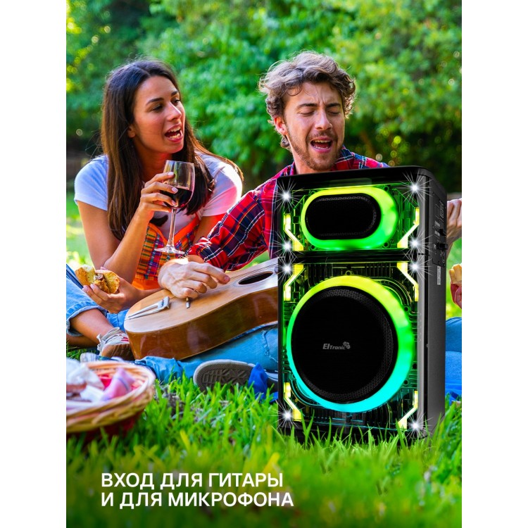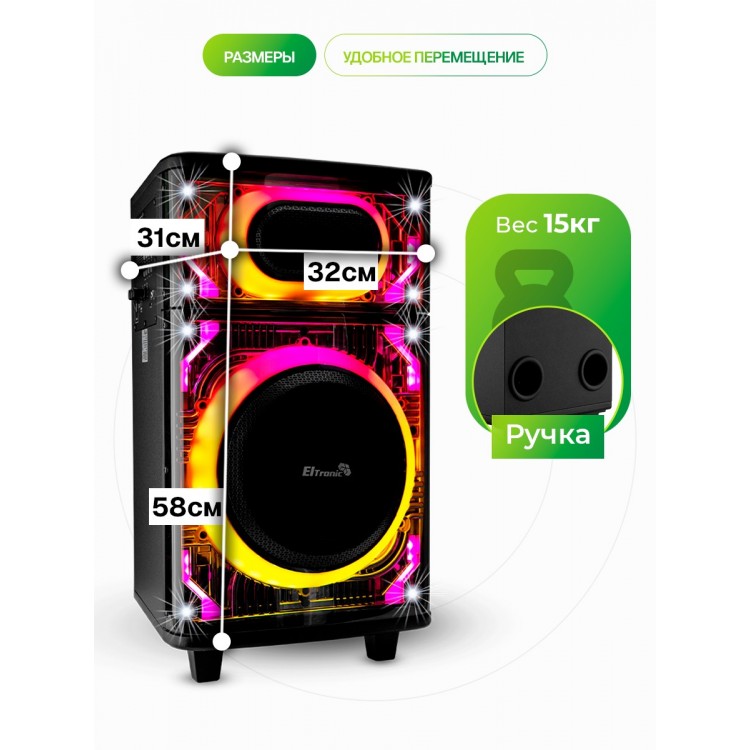 Название Акустическая система SKILLETS 30-82 BOX 1000, 10", Bluetooth, LED подсветка; Бренд Eltronic; Вид Моно; Питание 12 В; Управление Кнопочное, пульт ДУ, со смартфона; Минимальная воспроизводимая частота 50 Гц; Максимальная воспроизводимая частота 20000 Гц; Функции звука Регулировка ВЧ, регулировка НЧ, синхронизация колонок, эквалайзер; Материал корпуса MDF, пластик; Беспроводные интерфейсы Bluetooth; Разъемы и интерфейсы USB Type-A (для флэшки), вход аудио mini jack 3.5 mm, вход микрофонный - jack 6.3 mm; Время автономной работы 5 ч; Емкость аккумулятора 2200 мА·ч; Время зарядки 8; Особенности FM-радио, дисплей, карабин, поддержка microSD, ручка, световые эффекты; Ширина 320 мм; Высота 580 мм; Глубина 310 мм; Вес 15 кг; Вес c элементами питания 17 кг; Габариты транспортной упаковки 34x44x75; Вес в килограммах с учетом упаковки 17; Гарантийный срок 1 г; Цвет черный;