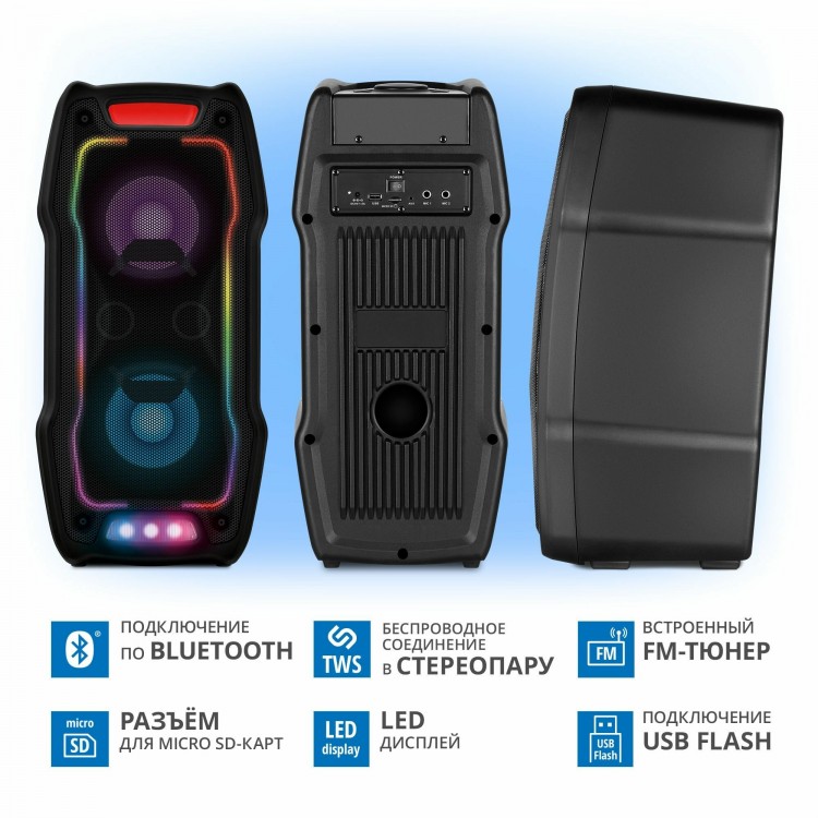 Звук супер. Батарею держит очень хорошо. Светомузыка. Подсветка.