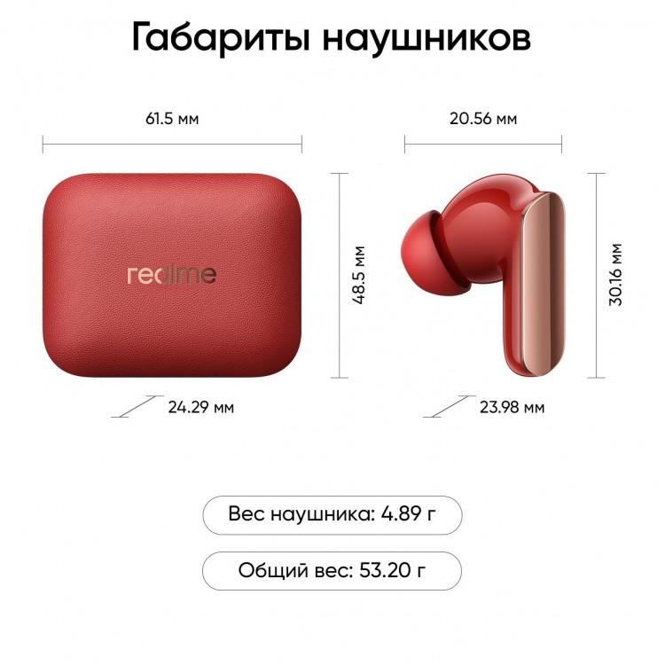 Название Наушники Buds Air 7 Pro, красные, с шумоподавлением, Hi-Fi звук, авиационный алюминий; Бренд Realme; Тип Беспроводные TWS-наушники; Конструкция Вкладыши; Беспроводные интерфейсы Bluetooth; Максимальная воспроизводимая частота 40000 Гц; Технология Динамические; Система активного шумоподавления (ANC) Да; Импеданс 20 Ом; Игровая гарнитура Нет; Вес 104 г; Тип крепления В ушной раковине; Разъем штекера USB Type-C; Версия Bluetooth 5.4; Поддерживаемые кодеки AAC, LHDC, SBC; Время работы 32 ч; Ширина 61.5 мм; Высота 24.29 мм; Толщина 48.5 мм; Вес (одного наушника) 4.9 г; True Wireless True; Время работы в режиме ожидания, ч 48; Время работы в режиме разговора, ч 26; Защита от влаги Да; Материал амбушюров Силикон; Наличие микрофона Да; Опции управления Взять/положить трубку, Остановка/воспроизведение музыки, Предыдущий трек, Регулировка громкости, Следующий трек; Питание от USB; Подключение Беспроводное; Подсветка Нет; Размеры, мм 61.5 x 48.5 x 24.29; Регулятор громкости Да; Совместимые платформы Android, Windows, iOS; Спортивные Нет; Способ зарядки От кабеля USB; Способ передачи звука Динамики; Управление наушниками Сенсорное; Шумоподавление Активное; Шумоподавление микрофона Активное; Цвет красный;