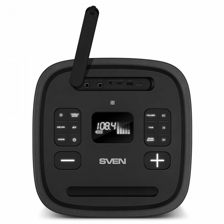 SVEN PS-1250 поддерживает Bluetooth и NFC, а также оснащена разъёмами 3.5 мм и USB. С помощью системы можно заряжать другие устройства.