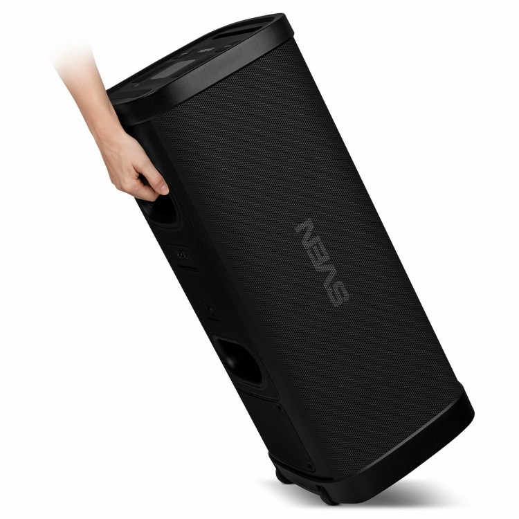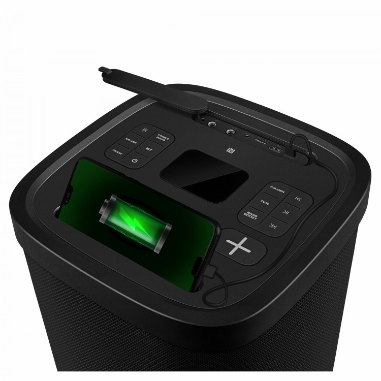 Система защищена по стандарту IPX4, что делает её устойчивой к влаге. Кроме того, у неё есть встроенный микрофон (функция HandsFree), световые эффекты, пульт ДУ и слот для карты памяти MicroSD.