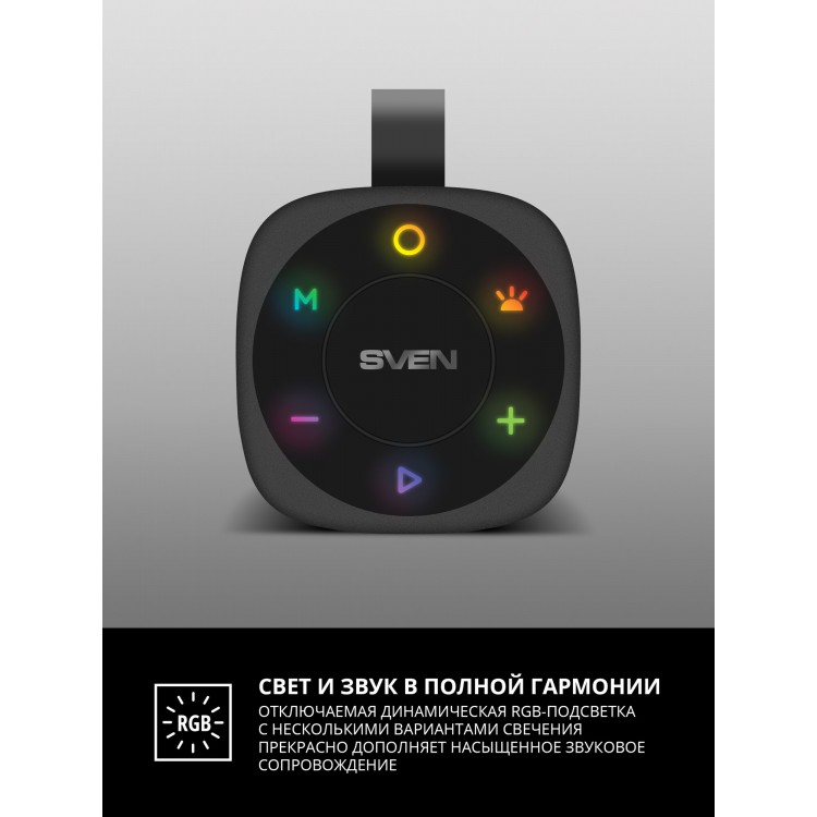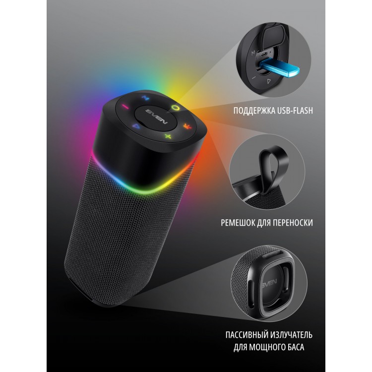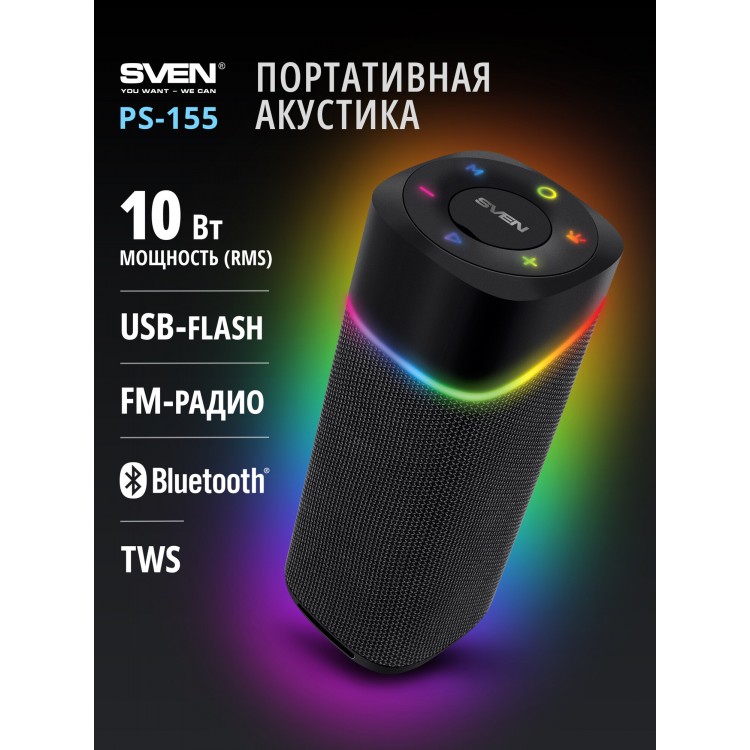 Акустика SVEN PS-155 имеет световые эффекты, оснащена FM-радио и возможностью зарядки других устройств. Максимальная мощность акустики — 10 Вт, и она поддерживает стереозвук.