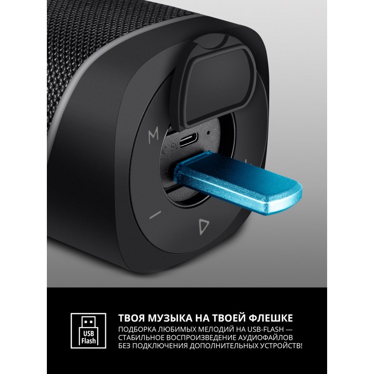 Благодаря Bluetooth вы можете подключить акустику к любому устройству и наслаждаться музыкой где угодно. Также есть разъёмы USB и USB Type-C. Время автономной работы составляет 24 часа, а зарядка занимает всего 4,5 часа.