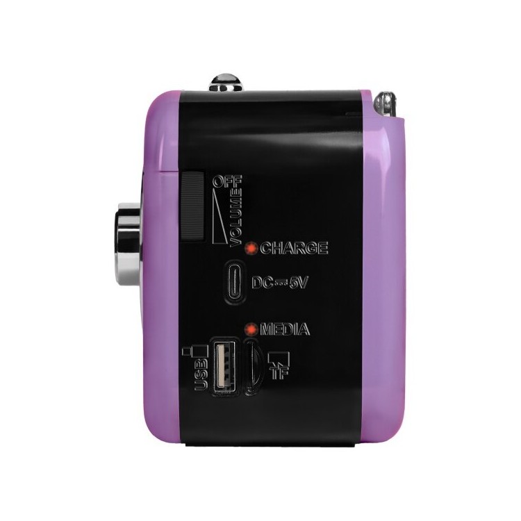Громкий и чистый звук в FM диапазоне. Хороший приём и селективность. Лёгкое и понятное управление с помощью ручек. Есть встроенный аккумулятор и отсек под батарейки. Провод для зарядки под usb зарядку.