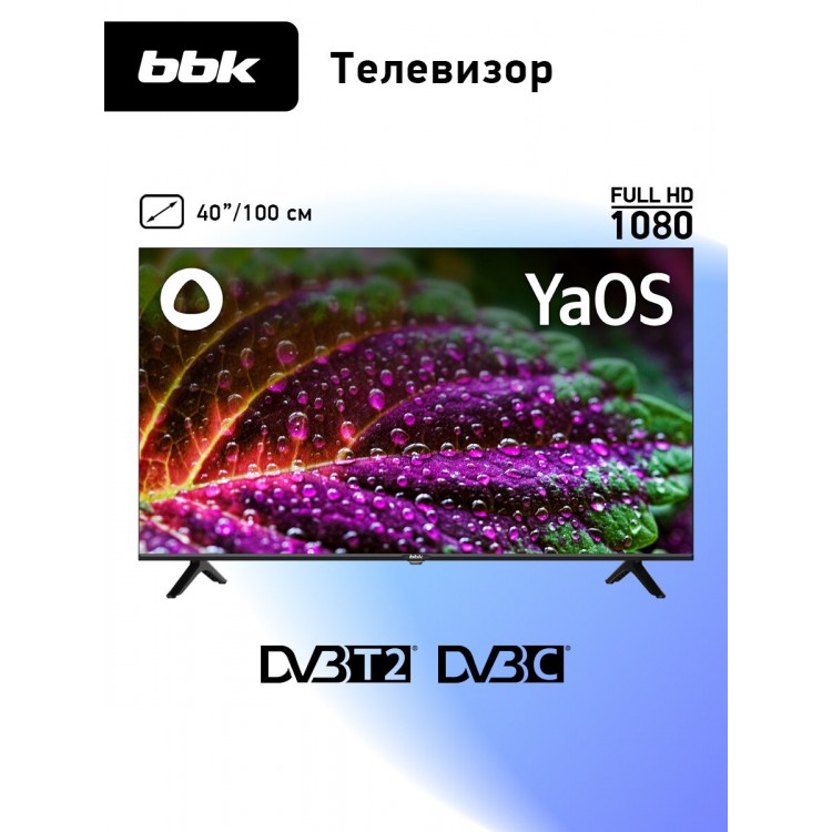 Название LED телевизор 40LEX-7232/FTS2C черный, 40", Full HD, Smart TV, Яндекс ТВ; Бренд BBK; Обязательные программы предустановлены Нет; Диагональ экрана 40"; Разрешение HD Full HD; Разрешение 1920x1080; Поддержка стандартов HDR Нет; Технология экрана LED; Соотношение сторон экрана 16:9; Тип подсветки Direct LED; Тип матрицы IPS; Яркость 200 кд/м2; Контрастность 5000; Угол обзора 178 °; Время отклика пикселя 9.5 мс; Частота обновления 60 Гц; Функции звука Стереозвук; Суммарная мощность звука 20 Вт; Количество динамиков 2; Разъемы и интерфейсы AV-вход, Ethernet - RJ-45, USB Type-A x 2, вход HDMI x 3, выход аудио цифровой коаксиальный, выход на наушники, слот CI; Беспроводные интерфейсы Bluetooth, Wi-Fi; Операционная система YaOS; Поддержка мультимедиа AVI, JPEG, MP3, XviD; Стандарты ТВ DVB-C, DVB-S2, DVB-T2; Особенности Таймер сна, телетекст; Стандарт крепления VESA 100×100 мм; Голосовой помощник Алиса; Оперативная память 1 ГБ; Размер встроенной памяти 8 ГБ; Потребляемая мощность 74 Вт; Год начала продаж 2025; Ширина 891 мм; Высота 555 мм; Глубина 215 мм; Вес 4.5 кг; Ширина (без подставки) 891 мм; Высота (без подставки) 514 мм; Глубина (без подставки) 70 мм; Дополнительная информация Комплектация: ЖК-телевизор, дистанционный пульт с голосовым управлением, подставка для телевизора - 1 компл., крепежные элементы - 1 компл., руководство по эксплуатации, гарантийный талон; Срок службы 48 мес., Эксплуатация при температуре от +10 до +35 0С; Гарантийный срок 12 мес; Smart TV Да; Встроенный медиаплеер Да; Высота, см 55.5; Изогнутый экран Нет; Интерьерный телевизор Нет; Количество разъемов USB 2; Мощность аудиосистемы, Вт 20; Мощность, Вт 74; Размер без подставки (ШxВxГ), мм 891x514x70; Размеры, мм 891х555х215 (ШхВхГ) с подставкой; Сабвуфер Нет; Технология HDR Нет; Число портов HDMI 3; Ширина, см 89.1; Цвет черный;