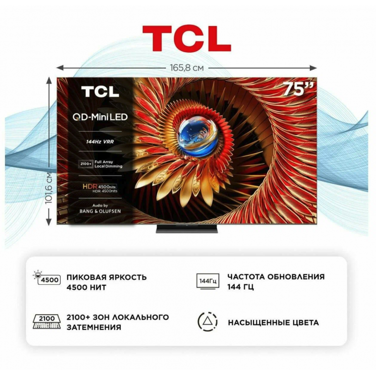 Телевизор TCL 75C8K поддерживает стандарты HDR HDR10, HDR10+, HLG, обеспечивая яркое и насыщенное изображение с яркостью до 4500 кд/м². Технология экрана QD-Mini LED и комплексная технология TCL по устранению ореолов гарантируют высокое качество картинки.