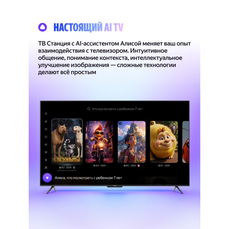 | Название | Умный QLED-телевизор YNDX-00093 "Яндекс ТВ Станция" с Алисой на YandexGPT, 43", UHD 4K (3840х2160), чёрный цвет |