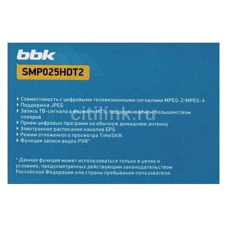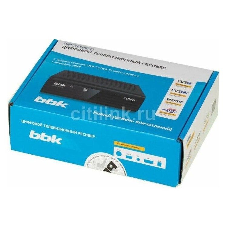 | Название | Цифровой телевизионный DVB-T2 ресивер BBK SMP025HDT2 черный, HDMI выход, USB флеш, пульт ДУ |