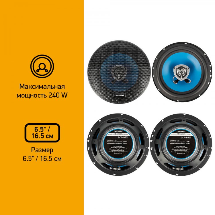 | Название | Колонки автомобильные Digma DCA-B602, 16.5 см (6 1/2 дюйм.), комплект 2 шт. |