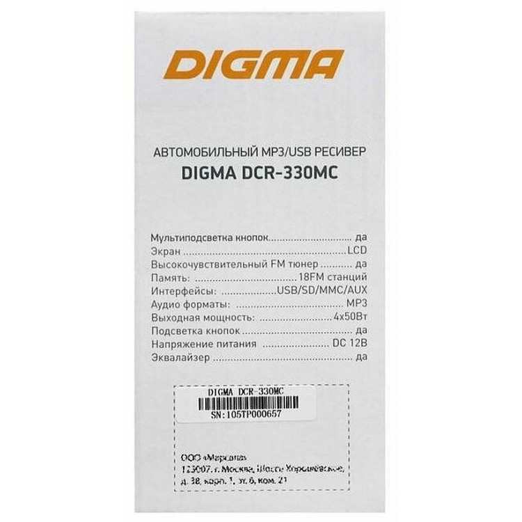 | Подробная комплектация | Автомагнитола Digma DCR-330MCдокументациямонтажный комплект |
