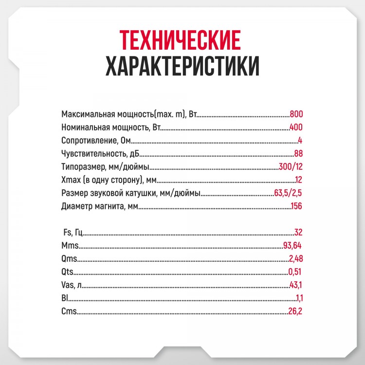 * Удобная конструкция: резонансная частота НЧ-динамика (Fs) 33 Гц, полная добротность НЧ-динамика (Qts) 0.44, эквивалентный объём НЧ-динамика (Vas) 56 л.
