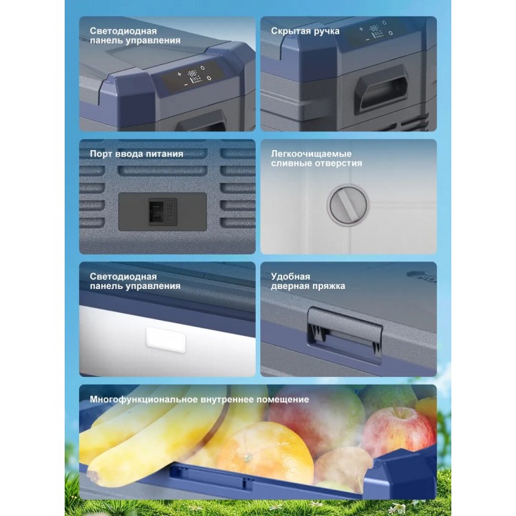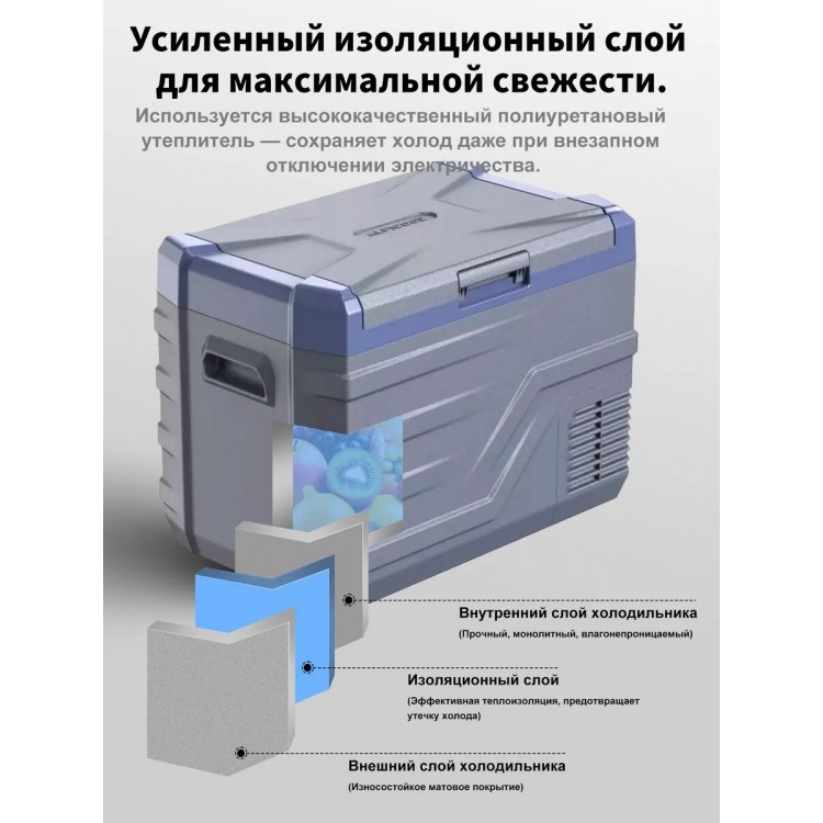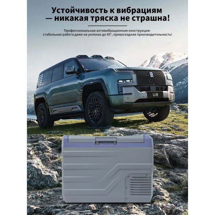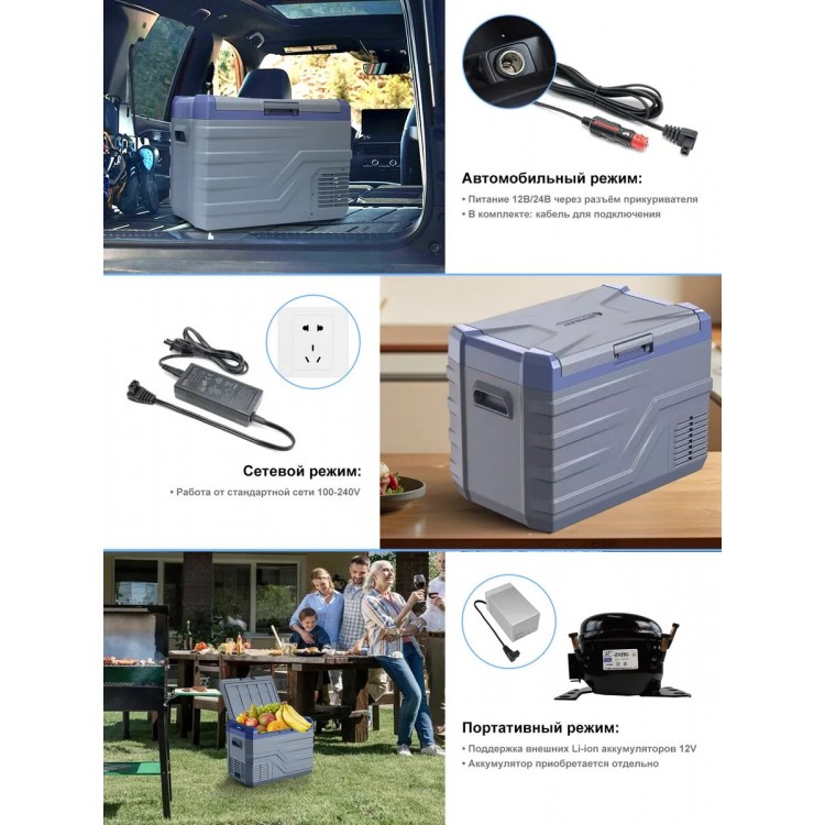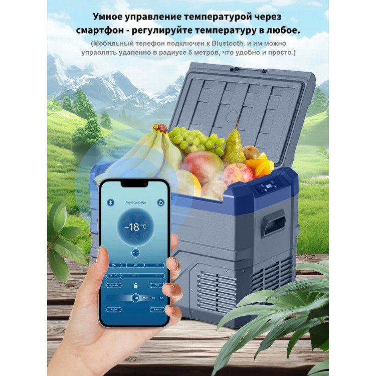 | Особенности | Ручки для переноски, Ударопрочность (работает при наклоне 45°), Универсальность (для авто/дома/кемпинга), Управление холодильником со смартфона |