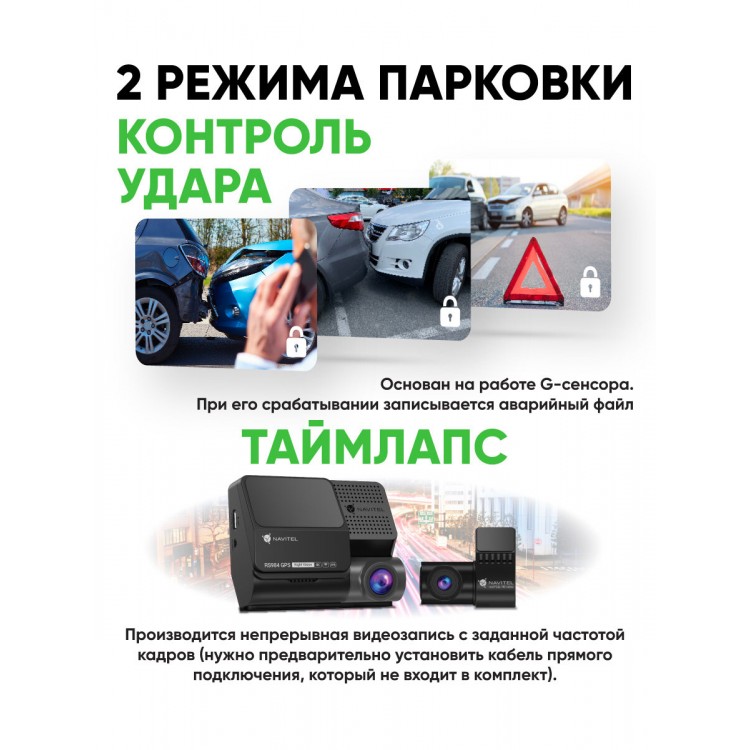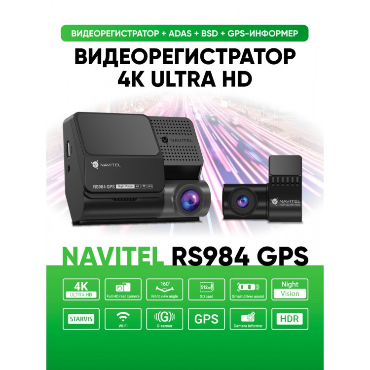 Видеорегистратор Navitel RS984 поддерживает HD 2160p и имеет разрешение экрана 480x854. Устройство позволяет записывать ролики без разрывов длительностью от 1 до 5 минут. Также есть функции детектора движения, записи времени и даты, скорости и возможность подключения внешних камер.