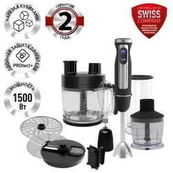 Венчик для взбивания. Блендерная насадка. Диск для нарезки кубиками. Диск для нарезки слайсами. Мерный стакан (800 мл). Насадка для пюре. Нож для измельчения. Чаша чоппера (1.5 л)
