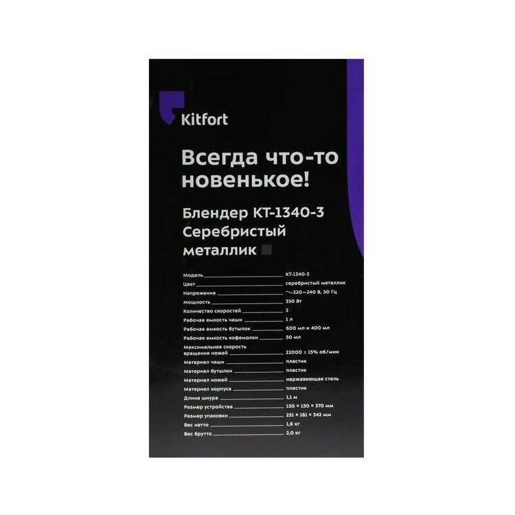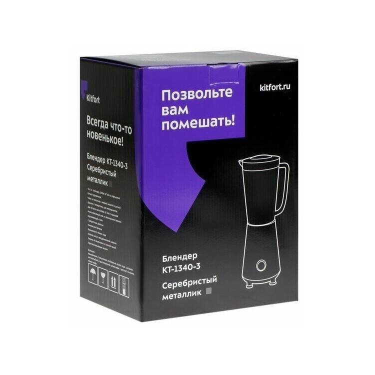 Сегодня был испробован блендер KITFORT КТ-1340-2, стационарный, голубой. Комплектация: сам блендер, чаша, кофемолка и 2 бутылки разного объёма, которые также подходят к блендеру и можно "блендерить" прямо в них, что очень удобно. Сам блендер достаточно мощный и превращает кусочки фруктов в смузи буквально за секунды. Является плюсом и то, что все насадки легко снимаются. Блендер компактный и удобный в использовании.