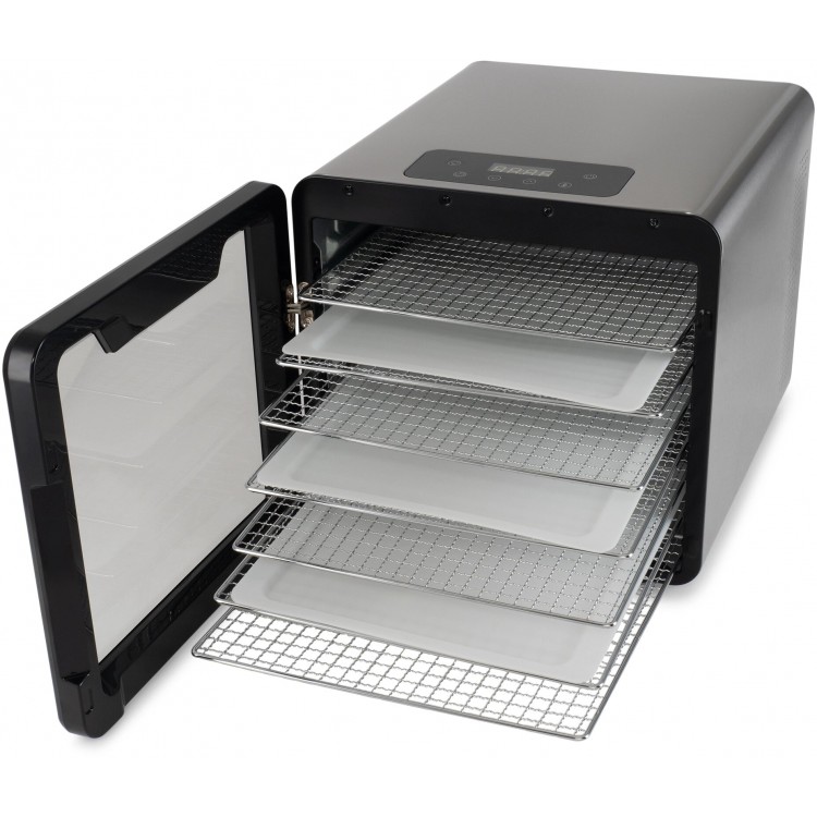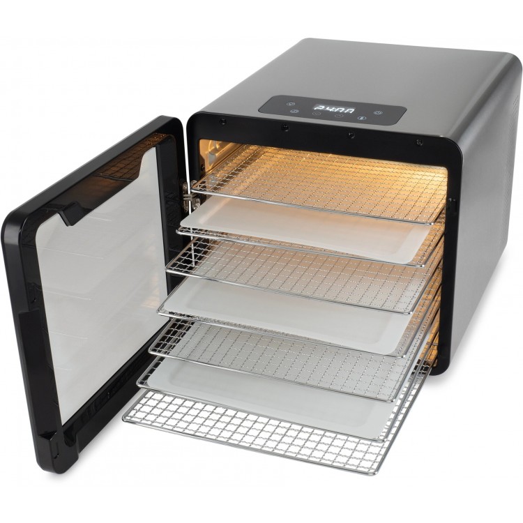 - Большое количество поддонов позволяет сушить много продуктов одновременно.- Регулировка температуры от 30 до 75 °C подходит для разных видов сушки.- Удобное сенсорное управление и лампа подсветки внутри.