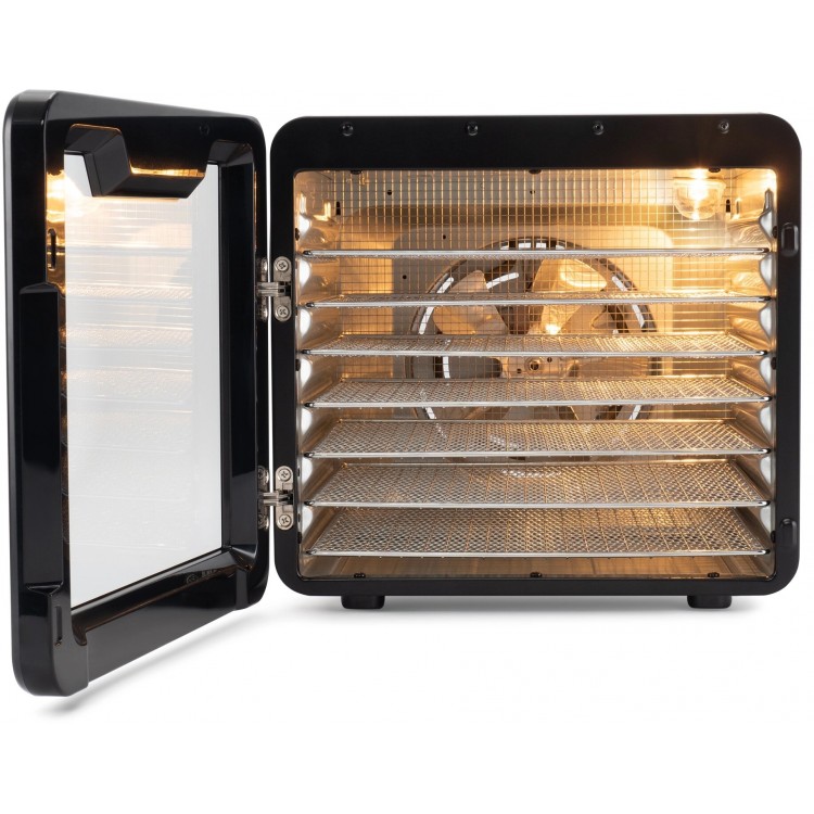 Сушилка оснащена лампой подсветки внутри камеры, которая позволяет контролировать процесс сушки, а также широко открывающейся дверцей для удобства загрузки и выгрузки продуктов.