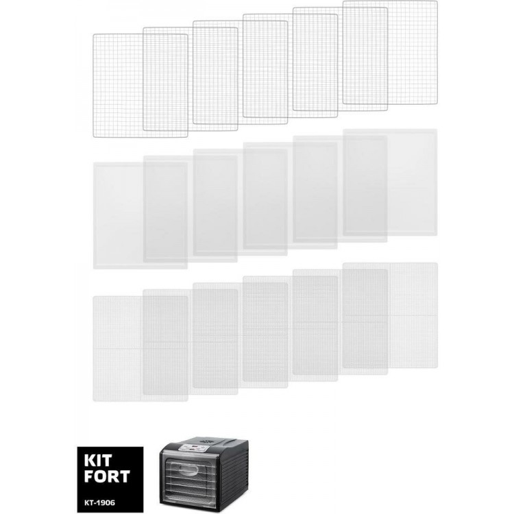 - три вида поддонов (крупная сетка -6шт, мелкая сетка -6шт и для пастилы -6шт);