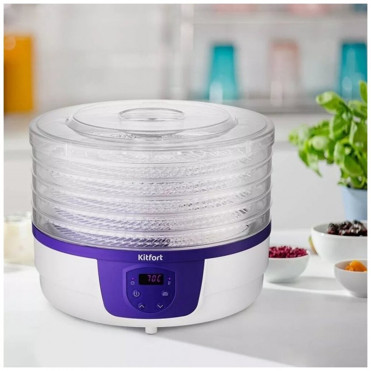 Сушилка Kitfort КТ-1929 оснащена дисплеем, таймером и регулировкой температуры сушки. Она также имеет защиту от перегрева и индикацию включения.