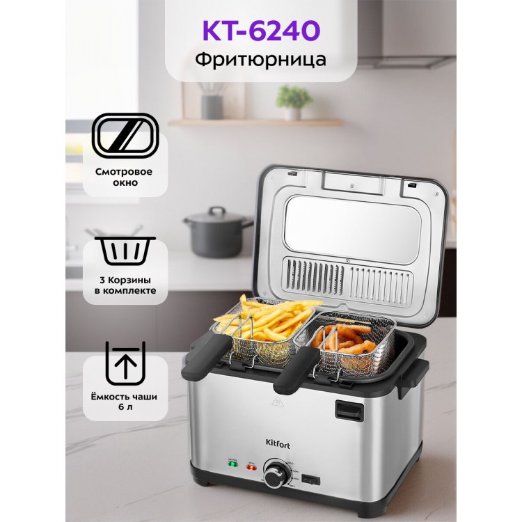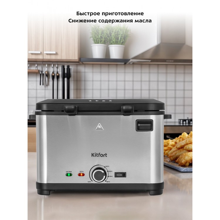 Приобрел фритюрница Kitfort 2018 по хорошей акционной цене. Критерием выбора были небольшой размер, небольшой объем масла для готовки, но в тоже время достаточно ёмкая корзина для небольшой семьи. Понравилось качество прожарки продуктов, достаточная мощность и температура, которая не падает при добавлении продукта. Готовил картошку фри и чебуреки. Всё приготовилось очень быстро и качественно, не сравнить с жаркой на сковороде. Уже имею кофеварку Kitfort которая служит второй год, надеюсь и фритюрница прослужит долго.