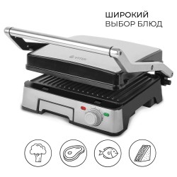 Антипригарное покрытие. контактный гриль. поддон для сбора жира. регулировка высоты верхней панели. съемные пластины