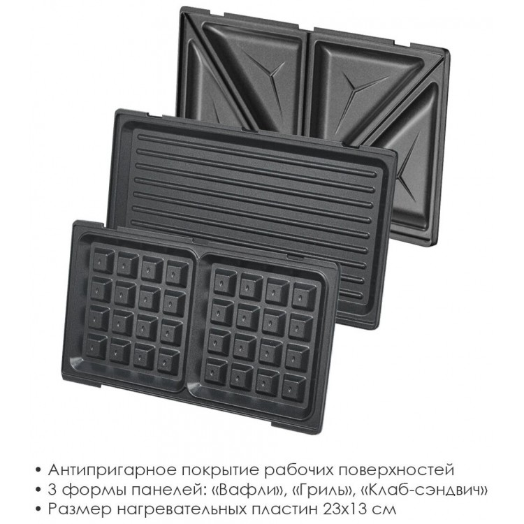 ️ Три вида панелей позволяют готовить разнообразные блюда: сэндвичи, вафли и блюда-гриль, что делает эту сэндвичницу универсальной и подходящей для различных кулинарных экспериментов.