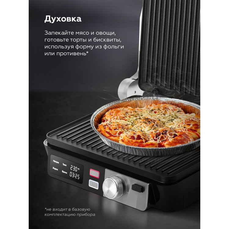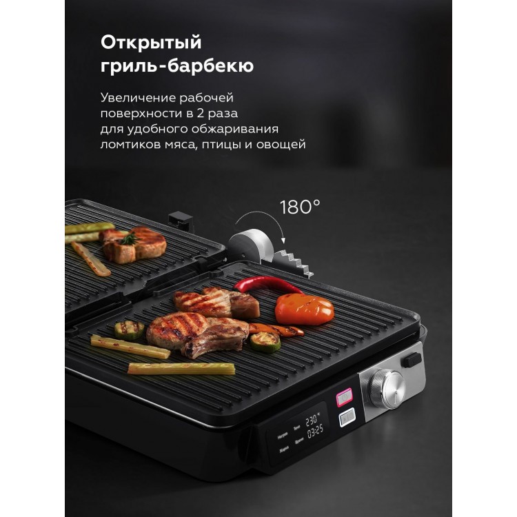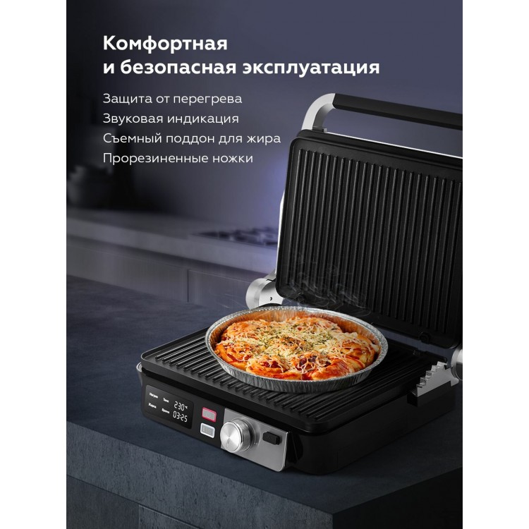 Дополнительные функции гриля — автоматическое отключение и защита от перегрева — обеспечивают безопасность использования. Цифровой дисплей и различные индикаторы делают управление грилем удобным и интуитивно понятным.