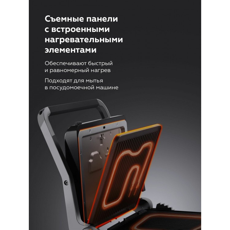 | Особенности | Антипригарное покрытие, поддон для сбора жира, Раскрытие на 180°, Сменные панели для приготовления, Съемный нагревательный элемент |