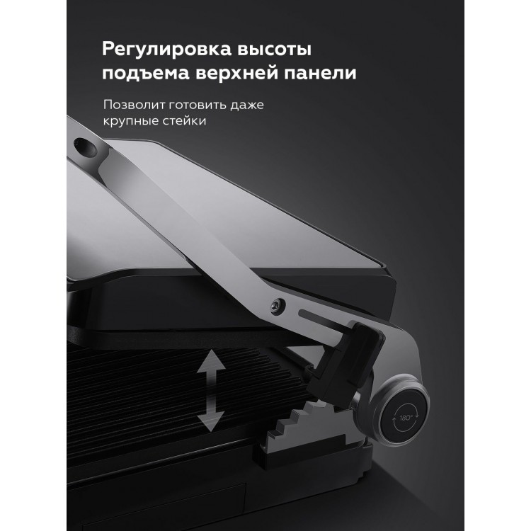 Корпус гриля выполнен из пластика, а рабочая поверхность — из металла. Антипригарное покрытие предотвращает прилипание продуктов, а поддон для сбора жира упрощает уход за прибором. Гриль раскрывается на 180 градусов, что позволяет готовить различные блюда. Сменные панели для приготовления расширяют возможности использования гриля.