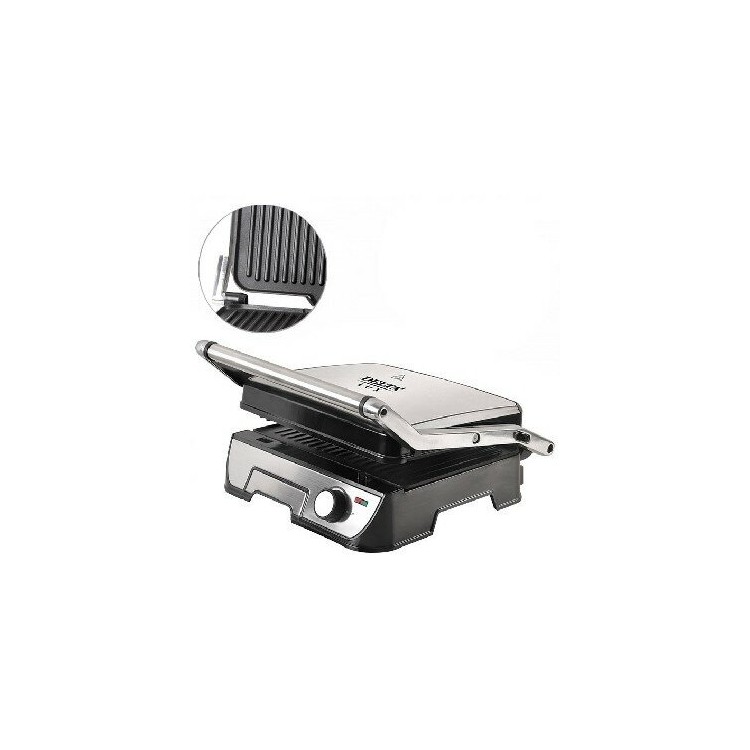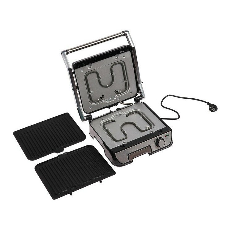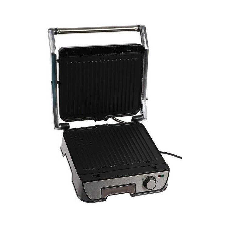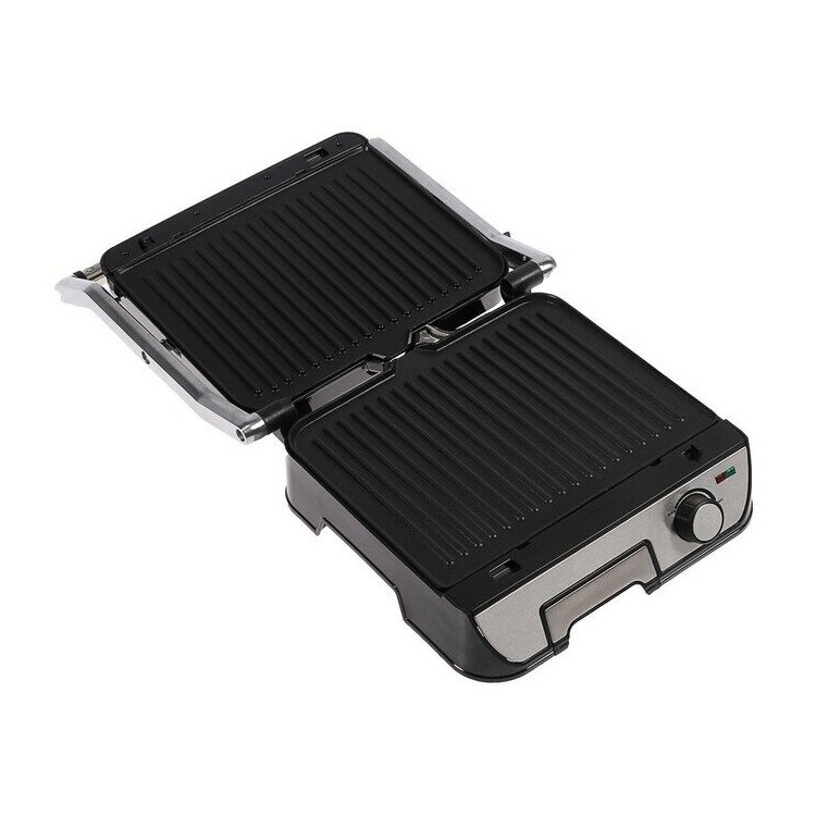 Корпус гриля выполнен из стали, а рабочая поверхность — из металла. Гриль раскрывается на 180 градусов, имеет антипригарное покрытие и поддон для сбора жира. Вы сможете легко готовить разнообразные блюда, не беспокоясь о пригорании и загрязнении поверхностей.