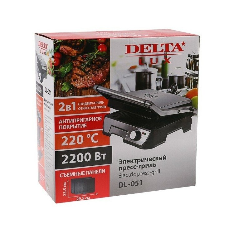 Купить гриль Delta LUX DL-051 серебристого цвета от бренда DELTA — отличное решение для вашей кухни в Рязани! Этот гриль оснащён механическим управлением и имеет мощность 2200 Вт, что обеспечивает быстрый нагрев.