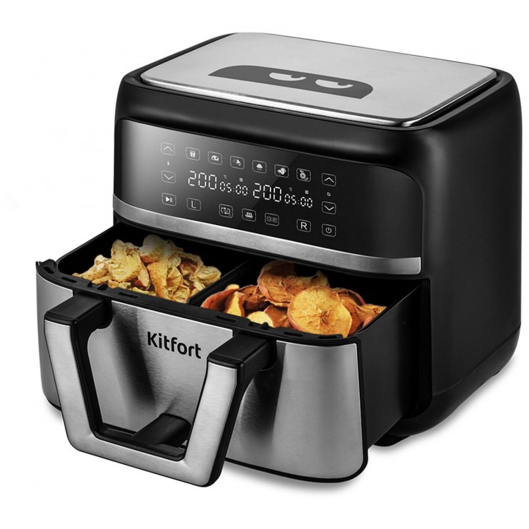Приобрели недавно аэрогриль KT-2256 и честно говоря не пожалели, а даже наоборот! По инструкции, как положено вначале 20 минут просто прокалили на 200 градусов в не загруженном состоянии. Это важно, ушли посторонние запахи от консервации. Т. к. аппарат 2х камерный, то решили сразу испытать обе. В одной картошку фри, в другой куриные крылья. Результат в целом порадовал, но в следующий раз попробую немного изменить режимы, чуть откорректировать, тем более это очень просто делать, на ходу меняя предустановленные программы. Скажу сразу, что настройка очень простая и интуитивная, думаю даже ребенок разберётся.