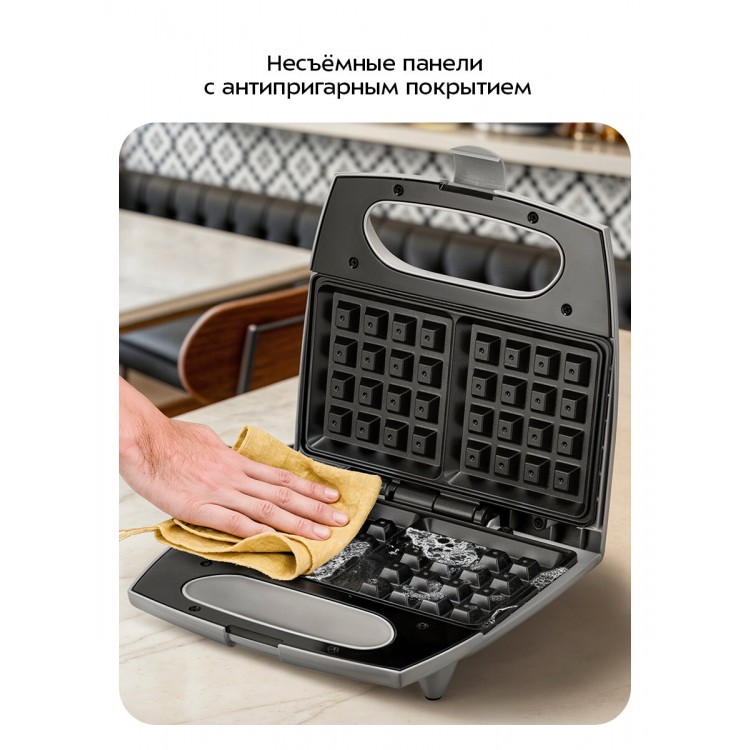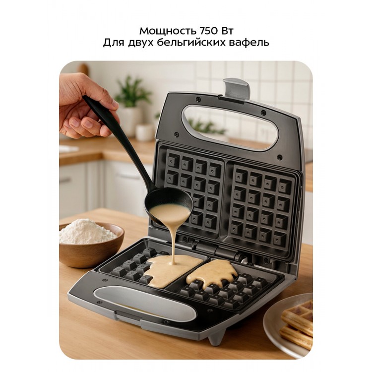 * Мощность 750 Вт обеспечивает быстрый нагрев и приготовление вафель.