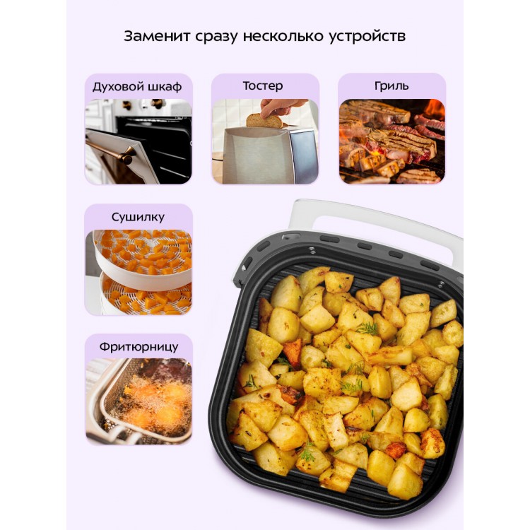 Скорость приготовления — картошка фри готовится за 15–18 минут, курица за 25–30. Значительно быстрее духовки.