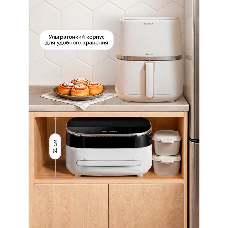 он более бюджетный и в принципе китфорт нам известен, уже несколько лет пользуемся их сушилкой. О выборе не пожалела, во-первых он достаточно компактный, поставила вдоль стены, ещё половина стола свободна. Во-вторых готовка без масла просто супер, картошка фри получается очень вкусной, без лишнего жира. Удобно, что есть разделитель чаши, можно готовить два блюда одновременно с разной температурой. Пока не приноровилась готовить крылышки, маринад подгорел, стандартной программы курица многовато, надо пораньше вытаскивать. В целом покупкой очень довольна, короткий шнур для нас не проблема, поверхность маркая, но тут просто протирать почаще. Спасибо продавцу и яндексу за быструю доставку