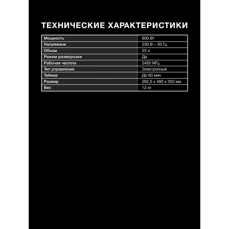 Объём этой микроволновой печи — 23 литра, что позволяет готовить большие порции еды.