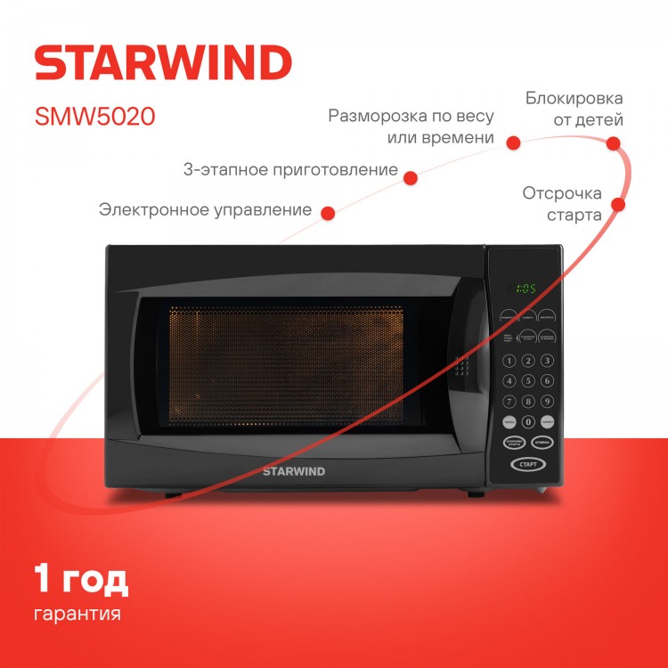 6 режимов работы, есть возможность установки таймера до 30 минут, мощность стандартная 700 вт, разогрев быстрый.