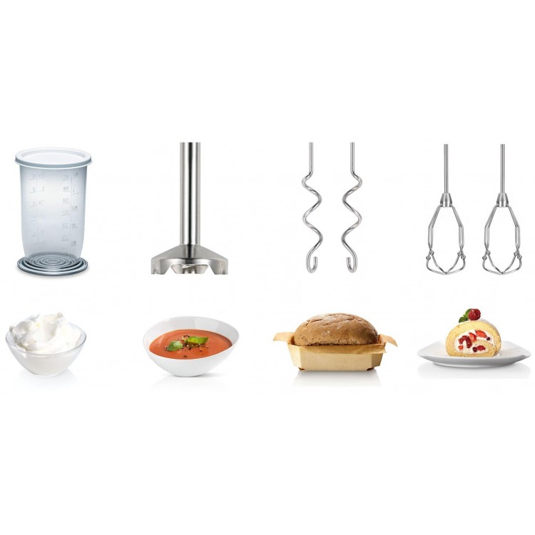 | Дополнительная информация | Количество типов насадок: 3 2 венчика для взбивания: есть Венчики из нержавеющей стали FineCreamer: есть 2 крюка для теста: есть Блендер: есть Ножка блендера из высококачественной нержавеющей стали: есть Стакан для перерабатываемых продуктов со шкалой: есть Крышка для стакана: есть |