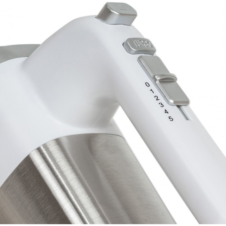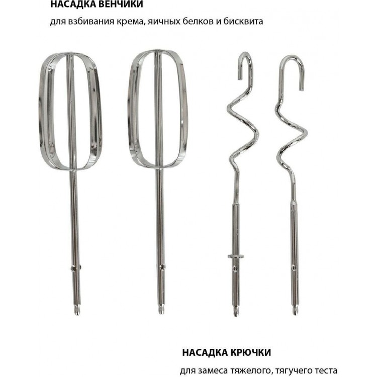 * Четыре насадки в комплекте. В комплект входят крючки для замешивания теста и венчик для взбивания, что делает миксер универсальным помощником на кухне.