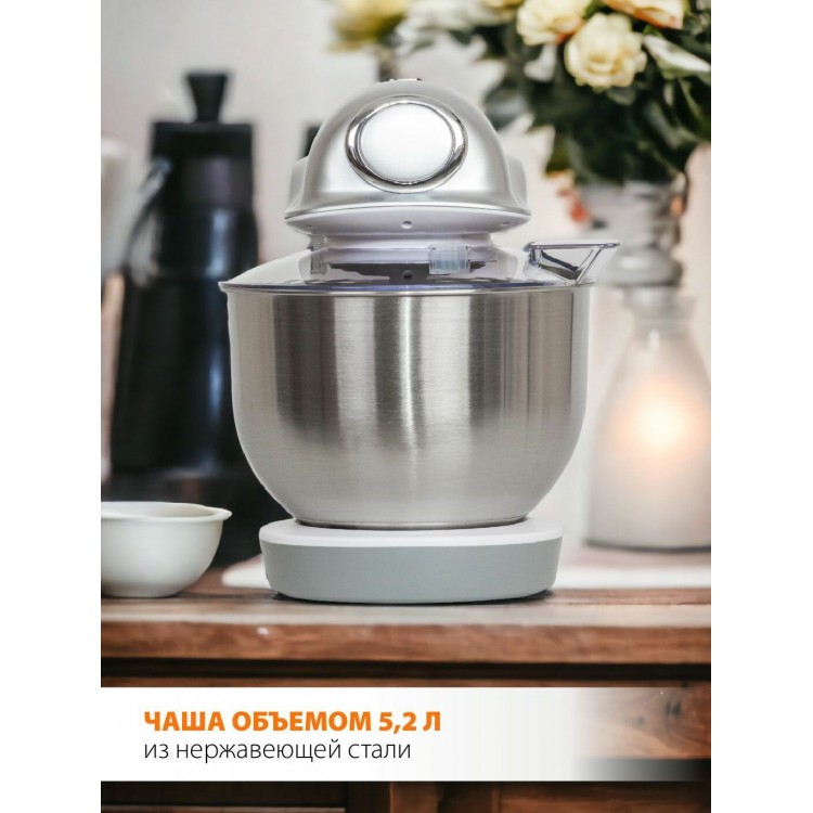 * Три насадки в комплекте: венчик для взбивания, крючки для замешивания теста и лопатка.