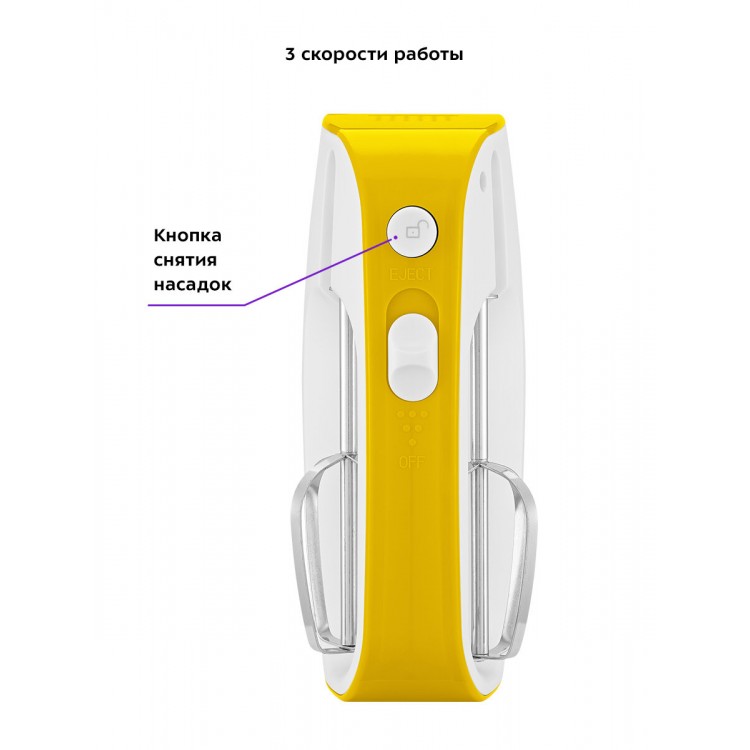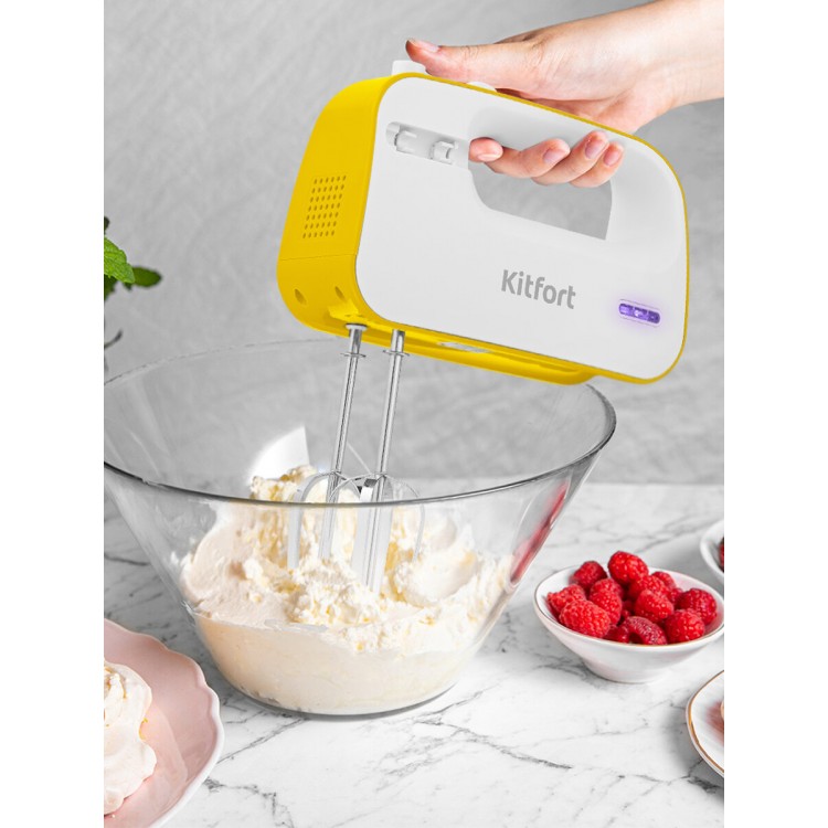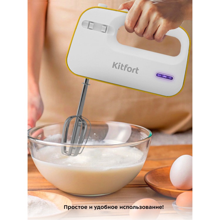 1. Яркий и стильный дизайнБело-желтая расцветка смотрится очень свежо и позитивно. Особенно подойдет для светлой кухни в скандинавском или ретро-стиле. Устройство визуально радует и не выглядит дешевым. 2. Компактность и легкий весМиксер удобно хранить даже в маленькой кухне. Он не занимает много места и легко достается при необходимости. 3. Простота использованияУправление интуитивно понятное — стандартный переключатель скоростей, кнопка извлечения венчиков. Даже ребенок разберется. 4. Достаточная мощность для повседневных задачВзбить яйца, сливки, тесто на бисквит, крем — справляется на ура. 5. Невысокая ценаKitfort традиционно предлагает доступную бытовую технику. Этот миксер — отличное соотношение цена/качество. Идеален как первый миксер или как временная замена более дорогой техники.