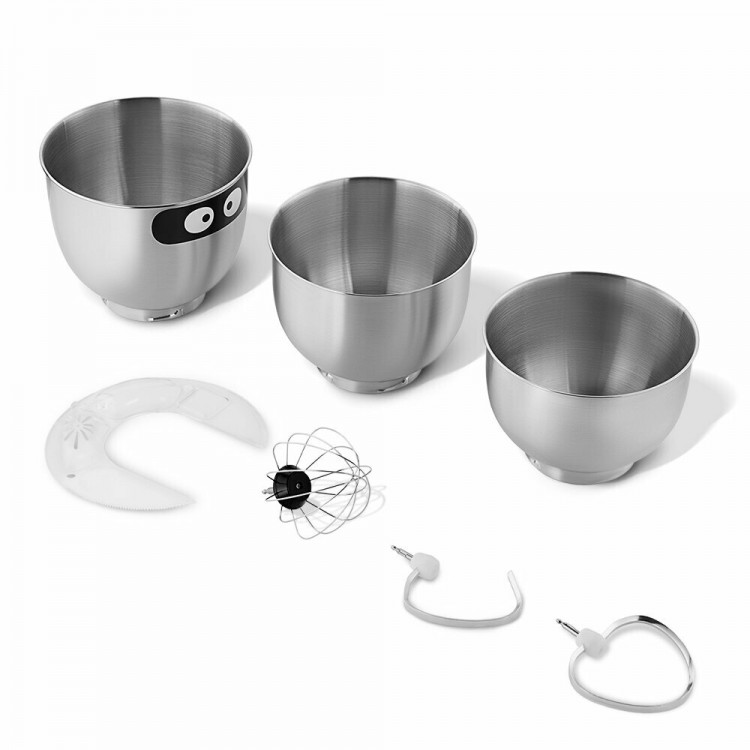Удобный и стильный миксер. Наличие 3 мисок это супер удобно - за 1 раз можно приготовить несколько блюд. Мощность кажется не слишком высокая, но для домашней выпечки достаточно. Все легко снимается и устанавливается.