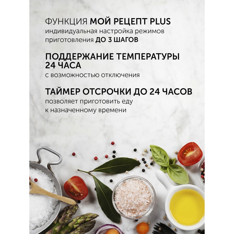 Готовит тихо, быстро. Фактически делает то, что любой человек ожидает от мультиварки. Есть даже функция су-вид и режим для выпечки. Когда заканчивает готовить - поддерживает блюдо в режиме подогрева.
