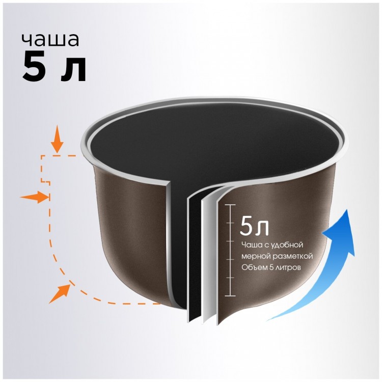 Большой объём 5 литров позволяет готовить блюда для всей семьи или большой компании.
